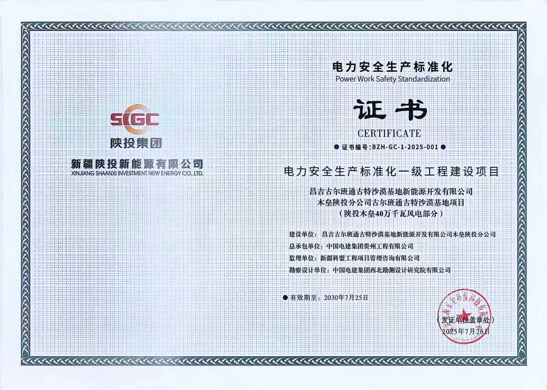 新疆木垒风电项目顺利取得电力安全生产标准化一级工程建设项目证书