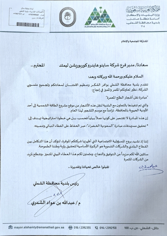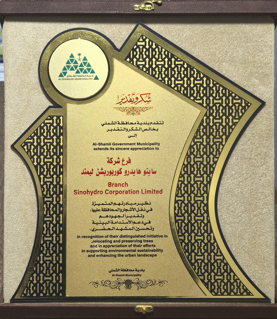 本网讯 近日,沙特R5 MAS光伏项目收到当地沙姆里市政府感谢信和表彰证书,对项目在富有成效杰出合作、成功实施“移植古老阿拉伯金合欢树”倡议以及在支持环境可持续性、提升城市景观两个方面所做出的努力以及高度的社会责任感给予肯定与赞扬。
